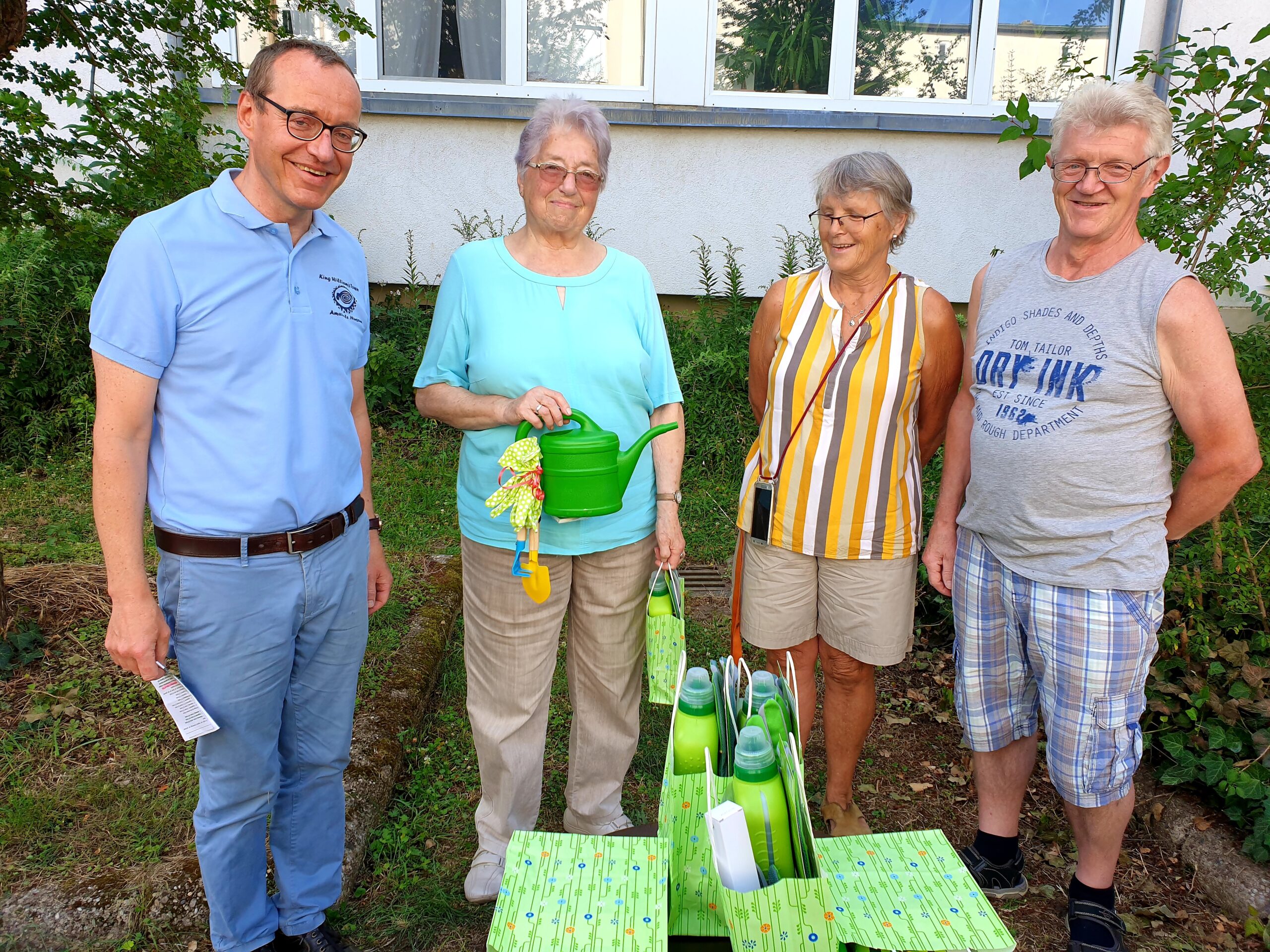Auf einem Tisch dazwischen standen Geschenktütchen. Die wurden nicht nur mit netten Worten, sondern auch mit Applaus an einige von den Menschlein verteilt. Ich glaube, es war das Blumentrio, das die Preise vergab. Die drei haben schon im Juni bei ihrem Rundgang durch die Siedlung für Aufsehen in der Vogelwelt gesorgt. Wenn ich richtig gehört habe – von meinem Beobachtungsposten waren es bestimmt zehn Meter – war die Gärtnerfamilie des Siegerbeetes im Urlaub. Doch eine Nachbarin, die auch ein Beet fleißig pflegt, hat den Preis entgegengenommen. Dazu gab es eine kleine Gießkanne.