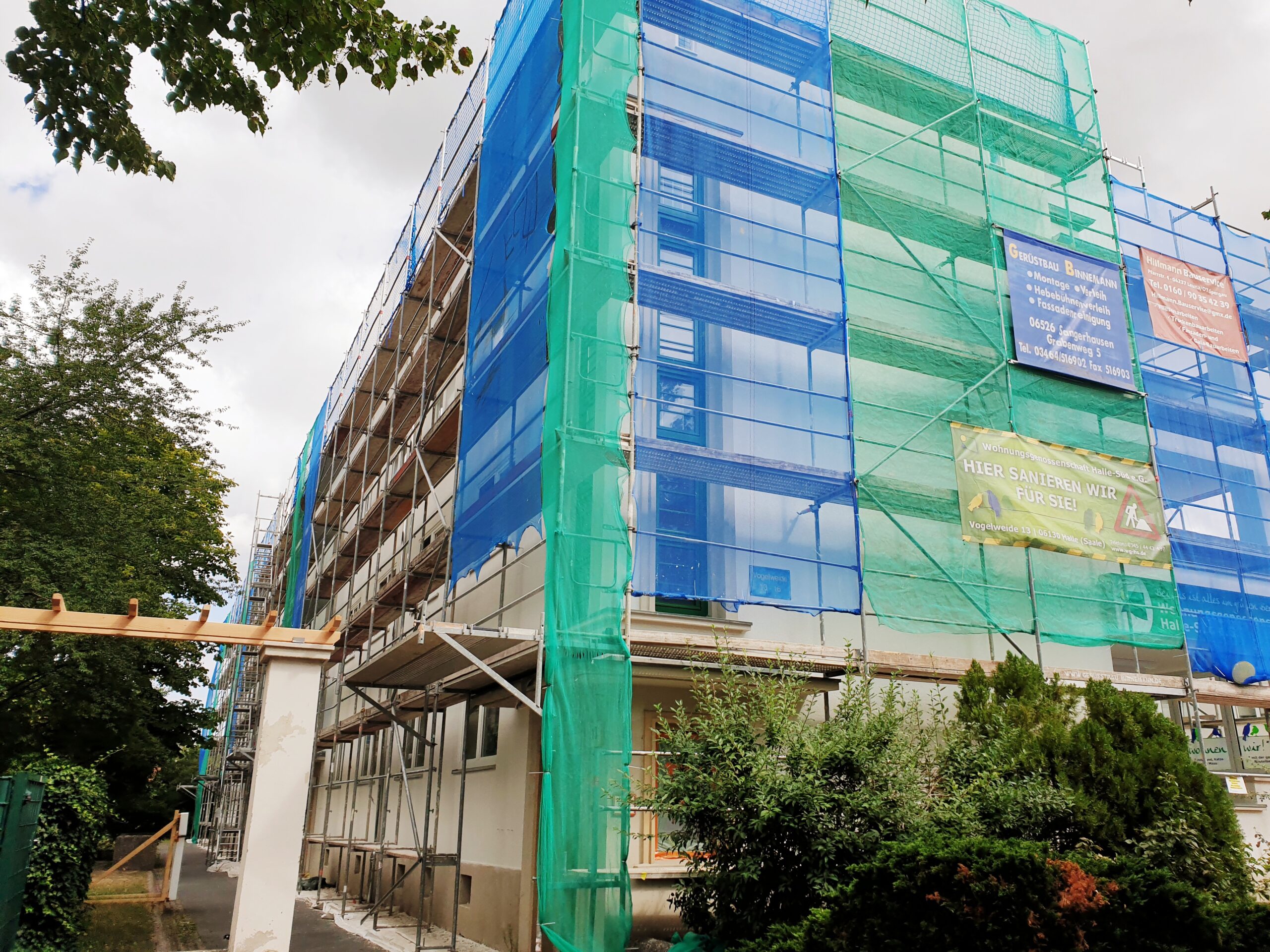 Ab 20.04.2022 stand das Gerüst an unseren Häusern Vogelweide 13 – 16. Lange Zeit waren auch die Fenster verklebt, um sie vor Beschädigungen und Putz zu schützen. Das war sehr anstrengend für die Mieter, ist aber notwendig. Ab 25.07.2022 erfolgte der Abbau des Gerüstes. Nun ist das Dach für die kommenden Jahre gerüstet und die Fassade erstrahlt im neuen Glanz.