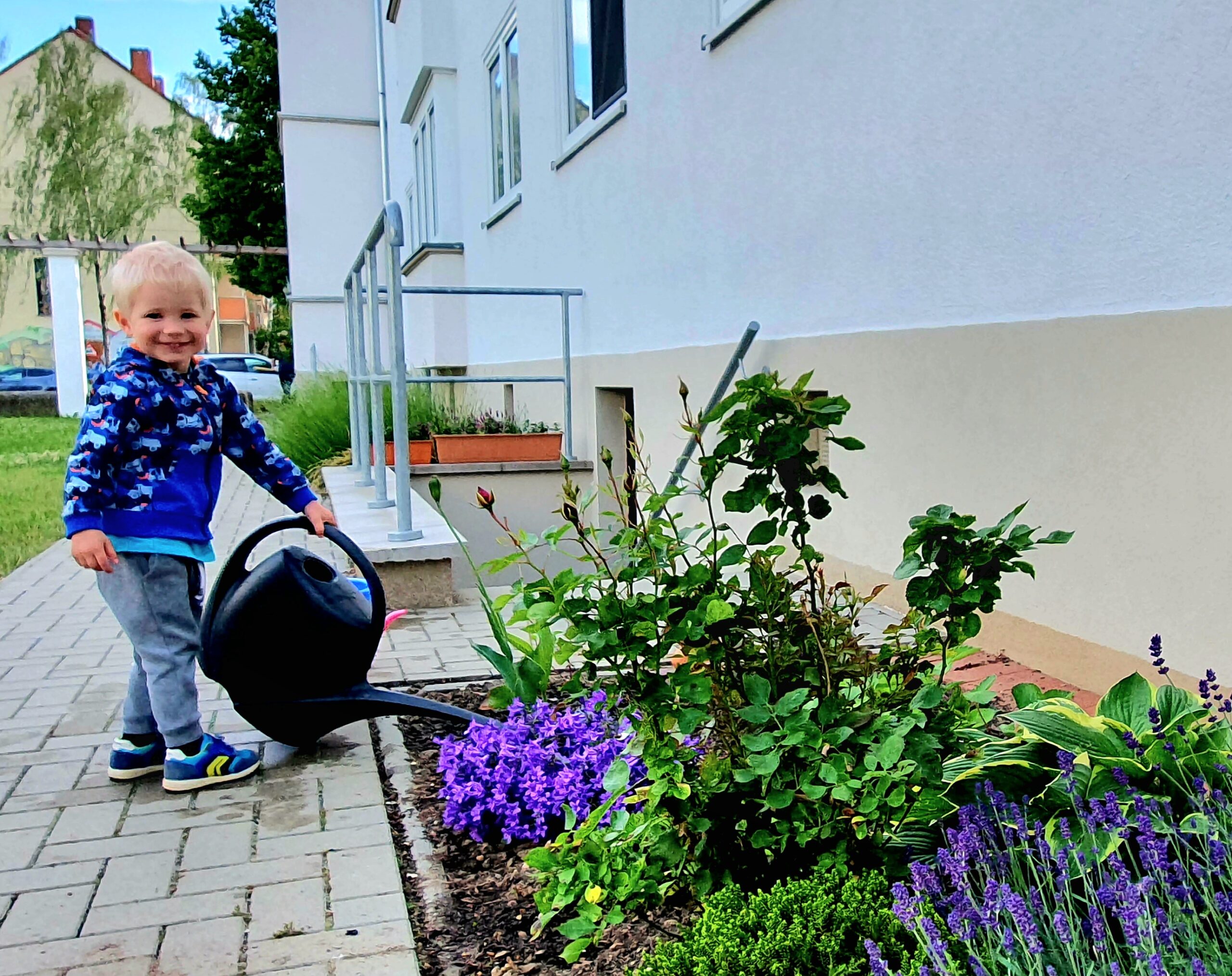 Dabei beeindrucken die Auswahl und die Anordnung der Pflanzen. Es ergibt sich ein schönes Gesamtbild mit den ebenfalls unter den ersten zehn platzierten Nachbarbeeten. Sie treten in einer Linie in Erscheinung. Das Besondere daran ist, dass drei Nachbarinnen und Nachbarn die Grünanlagen zusammen gestalten – Blumen-Frohsinn für uns alle. Das Foto zeigt den fleißigen Gärtnernachwuchs.