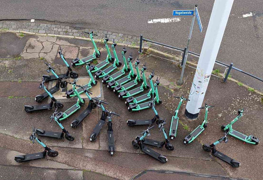 Seit 1. Juli 2022 hat die Stadt Halle (Saale) mit den Betreibern der E-Scooter-Flotte bestimmte Stellen im Stadtgebiet vereinbart, die als sogenannte Sammelplätze fungieren. Einer dieser Plätze ist offensichtlich die Ecke Vogelweide / Paul-Suhr-Straße an unserem Reisebüro. Da es sich um eine öffentliche Verkehrsfläche handelt, wurde diese Stelle auch nicht mit unserer Genossenschaft abgestimmt.