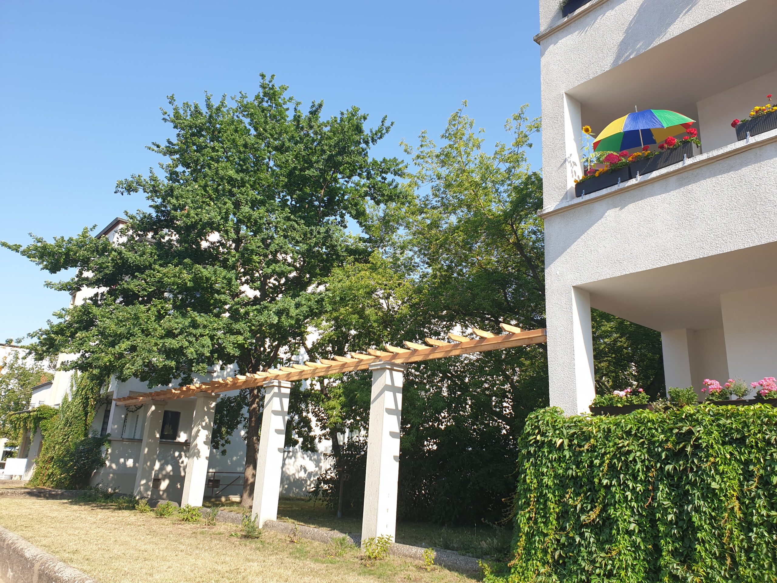 Am 19.07.2022 wurden die letzten Pergolen in der Vogelweide wieder komplettiert. Nun können sie ihren verbindenden Charakter zwischen den Häusern und Säulen wieder voll entfalten.